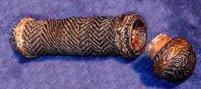 in sailtwine over a cane (bamboo) core with a nicely done stopper. The case is done in reversing sections of needlehitching which