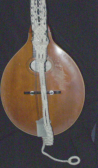 | Mandolin strap of true Belfast Cord in black and white. Head end is a black square sennit leading down into the body proper, which was done by larks-heading the white lines and then proceeding from there. At the next point, four of the black were lead into the centre and provide a contrast. At the end, the lines were reduced to form the end-button and cockscombed grommet. This is my performing instrument Appx 1983 |