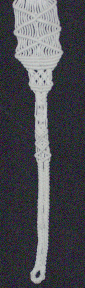 | Guitar strap of #21 unpolished white (well, it WAS, d'ye ken?) cotton twine. Another unsatisfactory line as this consistantly unlaid itself while being worked by the right hand. Chevrons required extensive re-positioning of the working ends and resulted in rather uneven diamonds. As I am unable to play guitar any longer, I no longer use this strap but I keep it around for memories and to remind myself NOT to use THAT particular cord again for fancywork. Bloody frustrating, it were! appx. 1985 |