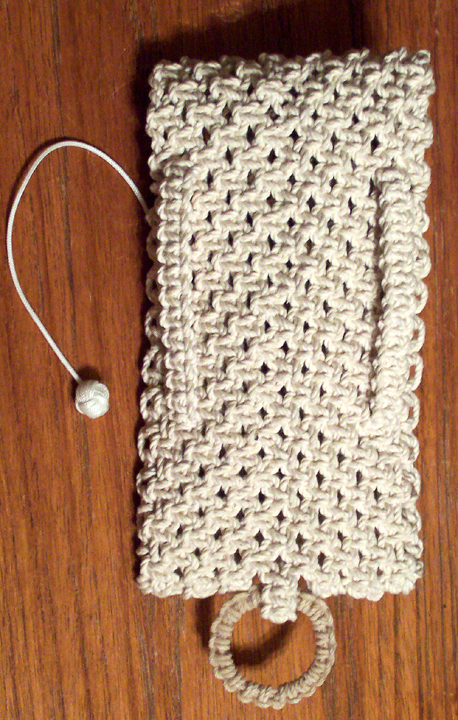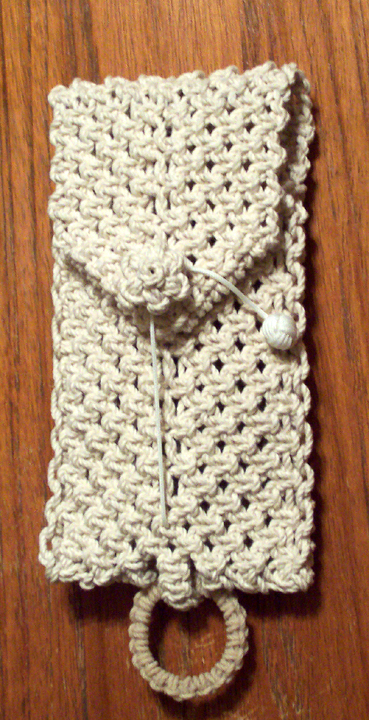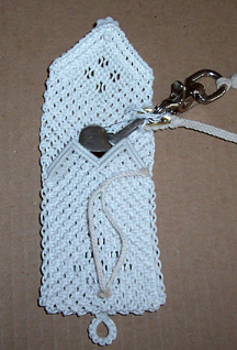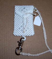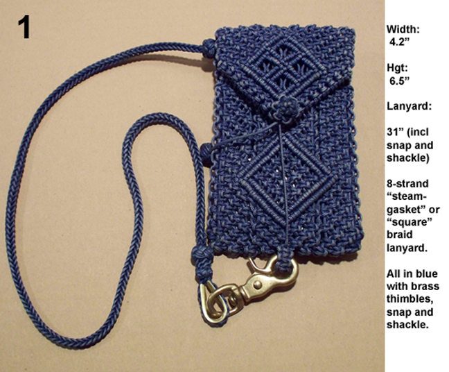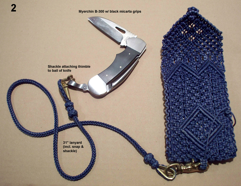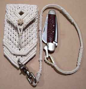 lanyard's eyes. Brass shackle attaches knife to lanyard. Pouch is of 9-knot (4.2" x 6.5" closed) square-knot