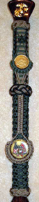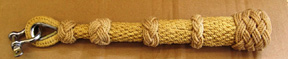 of a square-knot belt, a ringbolt or "Spanish" coxcomb capped by two three-strand turksheads, two more Boatswain's Call lanyards