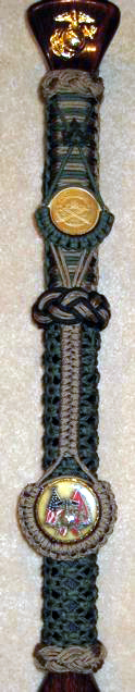 ring-bolt hitching. Mounting the coins in the 550 cord was a pain... but it eventually worked. The handle on the back is the Marine's