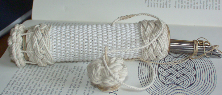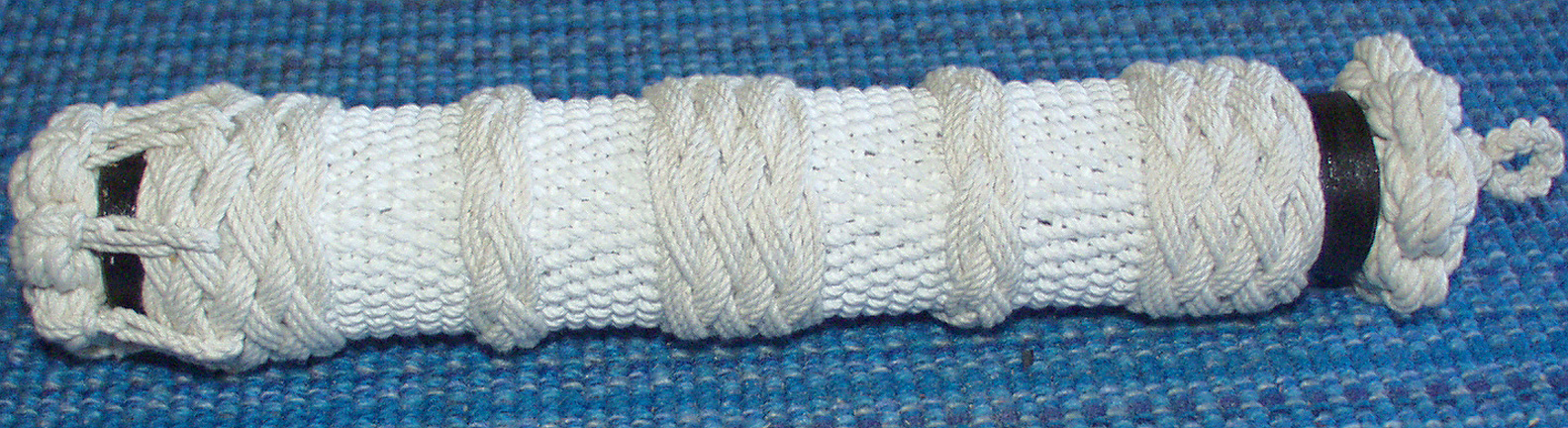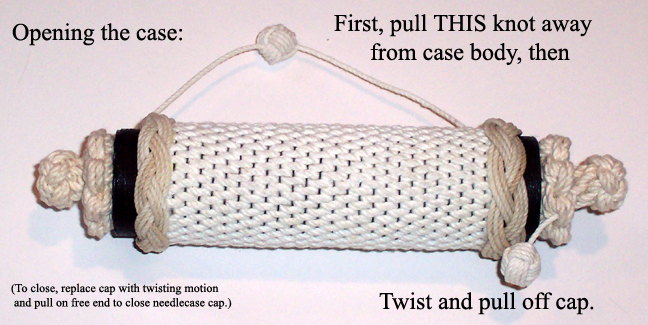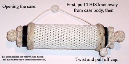 The case weave is of #15 cotton seine twine: 020606 has a fixed (glued-in) starknot stopper for a