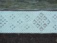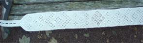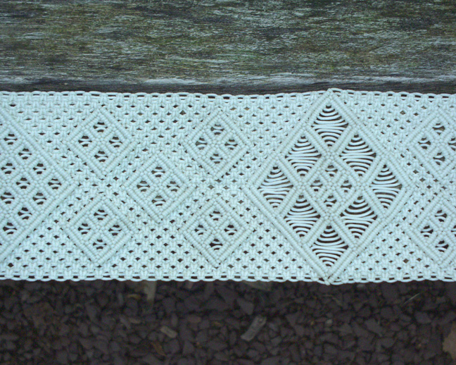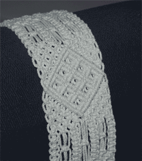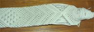 | Here's two pics of an experimental strap/belt I'm working on at present: it's out of polyester cord appx. #9 gauge (1.4mm) and the cord eats my hands up so that I can only do it as they heal and callus over. The cord actually cuts thru the callus! I can't imagine anyone being so looney as ever to order one**, but it'll make a nice demonstration /display piece. 4.75" wide, 52 lines nylon cord. Est. value: $1400.00 |