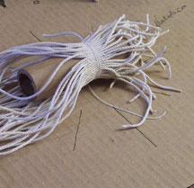Determine what size line you will be using for the warp line... I recommend a line about 1/4 the size of the wefts if you’re using a larger size line for them (if you're covering a large object) but for smaller lines where you’ll be using say a 1/8” or 3/16” line, then DUCKWORKS has a nice unwaxed sailtwine in white which does the trick for me quite nicely.... if you’re doing this on something small like the letter-opener, then Coats & Clark’s Heavy-Duty Button thread is a good choice.